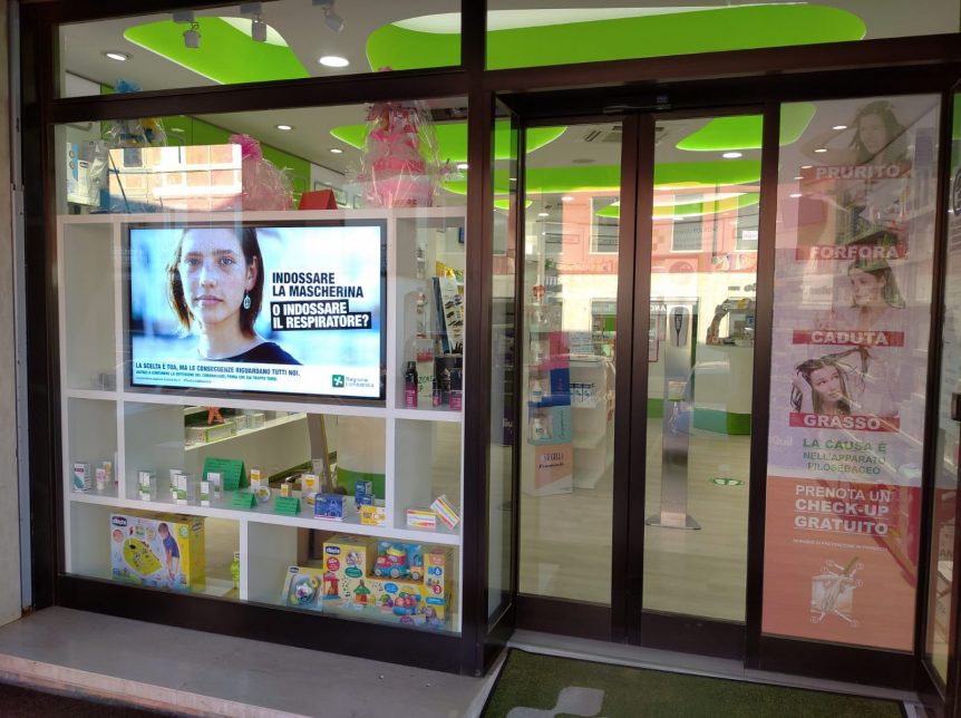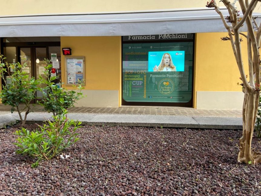 Ci siamo occupati di rinnovare interamente la vetrina della farmacia Pacchioni di cavezzo in particolare ci siamo occupati non solo dell’installazione della staffa a sospensione da soffitto e dell’installazione del monitor OM55N a 4000 nit di Samsung , ma anche della vetrofania personalizzata in modo da poter ricavare un ufficio nel retro del monitor garantendo il massimo della privacy .